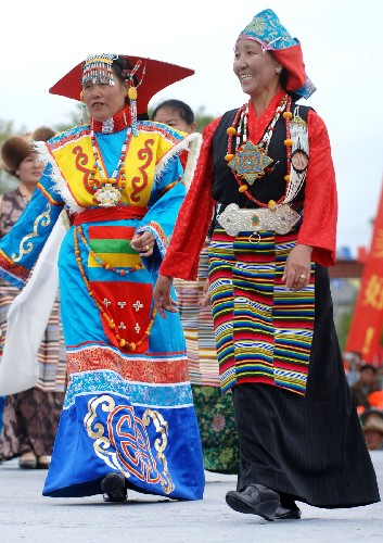 日喀则地区群艺馆的藏族老阿妈在展示后藏妇女服饰