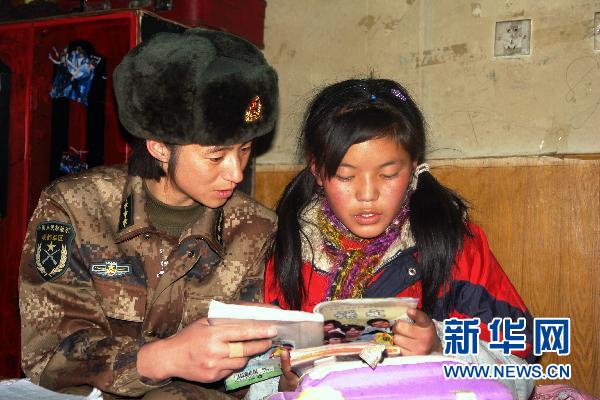 彭燕(左)给那曲孤儿院的孩子辅导功课(2010年3月31日摄)。 新华社发(赵海波 摄)