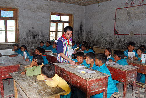 西藏自治区察隅县委书记彭聪恩徒步三天进入不通公路的察瓦龙乡调研,图为调研期间在察瓦龙小学给孩子们讲爱国主义教育课。