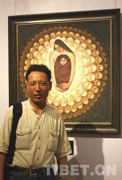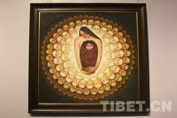 我徜徉在充满藏域风情的海洋,不觉在这样一幅画前停住了脚步:一位藏族阿妈怀抱婴儿,置身于由骷髅头组成的多层轮盘中。这就是西藏美术家协会副主席兼秘书长计美赤列的画作《轮回》。孩子好奇的双眼,母亲静谧的面容,让我恍悟自己就是那个被阿妈怀抱着的婴儿,或又突发其想,也许几年之后,我亦是那个怀抱婴儿的阿妈。生命在我们之间传递,而我们的每一次新生也在先辈的“目光”与“庇佑”之中延续……