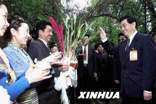 2001年7月20日,胡锦涛在拉萨罗布林卡公园参加游园活动,与藏族干群共庆西藏和平解放50周年。