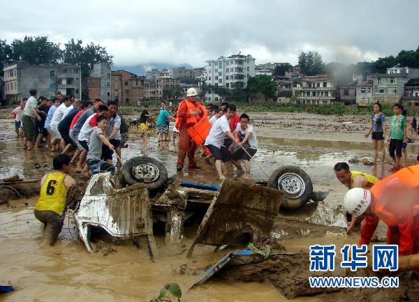 6日凌晨,正在县城办事的打易镇派出所副所长向翔接到电话,辖区内出现暴雨,发生山洪,便立即与随行的派出所副教导员何会洋、民警刘克庄连夜驱车赶回打易镇。他们一路上用喊话器警示村民疏散,引导群众撤至安全地带。当警车行驶至距县城19公里的新屯镇纳岜村时,人和车被卷入洪流。