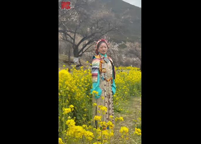西藏林芝市嘎拉村桃花源内,金黄的油菜花海与藏装相互映衬,春意...