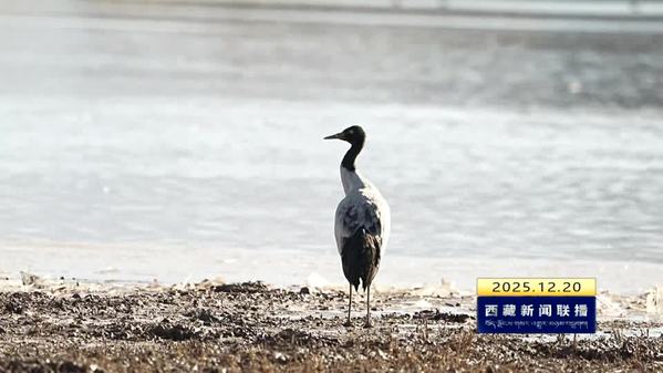 在拉萨市林周县卡孜水库,黑颈鹤成群栖息,“绘”出一幅动人的生...