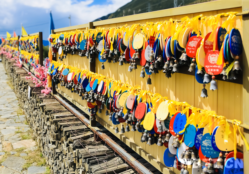 曾经的荒草滩,如今水量充沛、绿树成荫,成为了沙棘、黑颈鹤、赤麻鸭、斑头雁、绿头鸭等重要野生动植物的生长和栖息地。同时,湿地生态的有效保护促进了当地农牧民群众的经济收入,使当地群众吃上了生态饭。图为苯日景区入口处的许愿挂件 摄影:龙真多吉