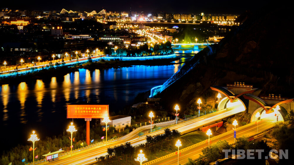 图为拉萨河畔南环路上的车轨,为拉萨的夜晚增添了繁荣的点缀 摄影:央拉