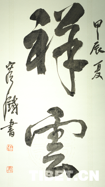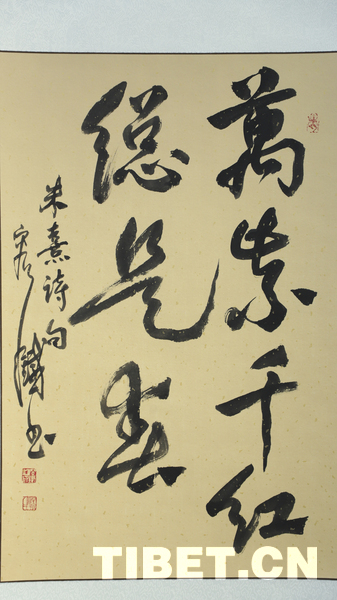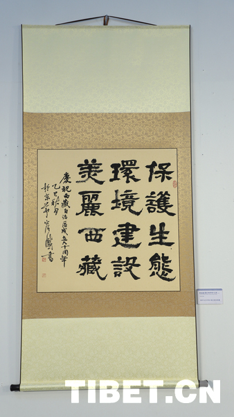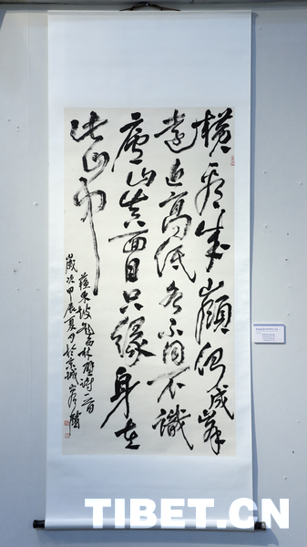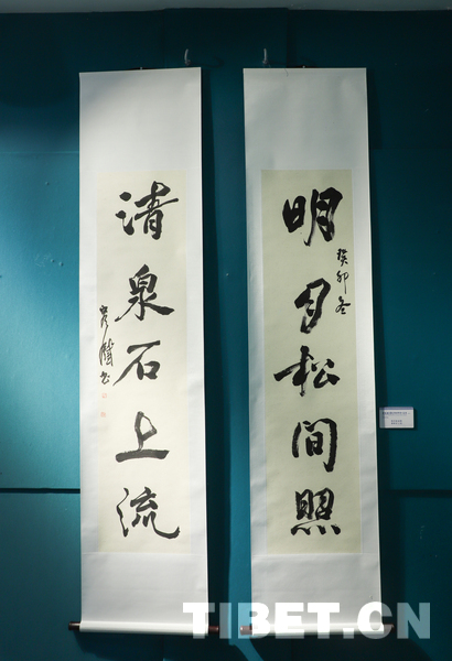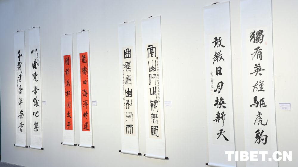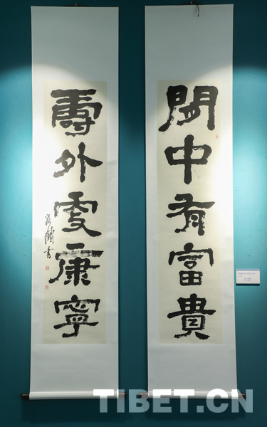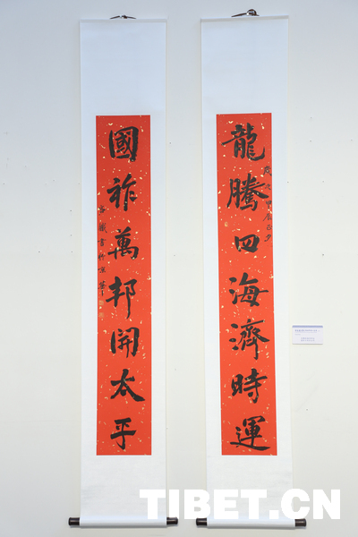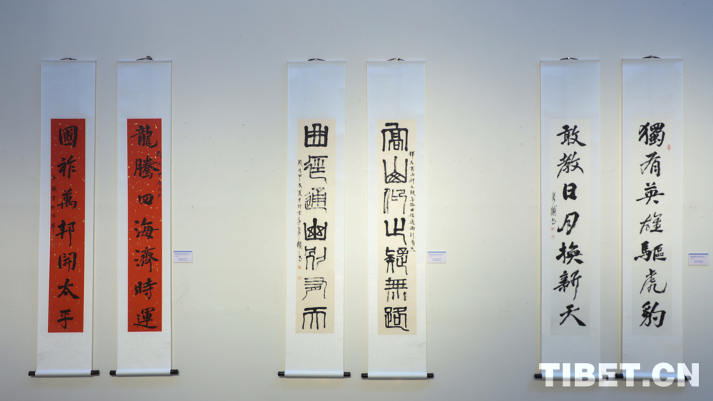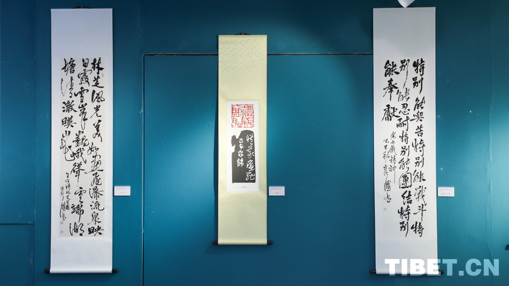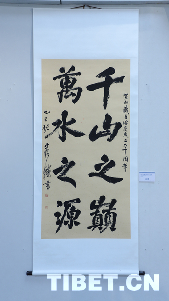 中国西藏网讯 9月18日,庆祝西藏自治区成立60周年——容铁书画篆刻作品捐赠公益展开幕式在西藏自治区群众艺术馆举行。本次展览展出了艺术家容铁精心创作的60幅书法、美术及篆刻作品,这些凝聚心血与匠心的艺术力作已无偿捐赠给西藏自治区,由西藏自治区群众艺术馆永久收藏与展出。 (中国西藏网 记者/贾华加)图为展出的容铁书法作品
