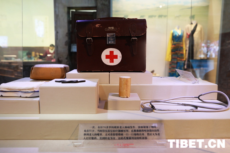图为山东聊城孔繁森同志纪念馆馆藏国家一级文物——孔繁森同志的小药箱。孔繁森同志在西藏工作时,每次下乡都会带着这只小药箱,里面是他自费购买的药品,工作的同时,他还为边远地区看病不便的群众免费送医送药。一次,有位70多岁的老人肺病发作,浓痰堵塞了咽喉危在旦夕。当时没有其它医疗器械可用,孔繁森就是用图中这只听诊器的胶管伸到老人的嘴里,又对着胶管将痰一口一口地吸出来,然后又为老人打针服药,直到转危为安。 摄影:刘莉