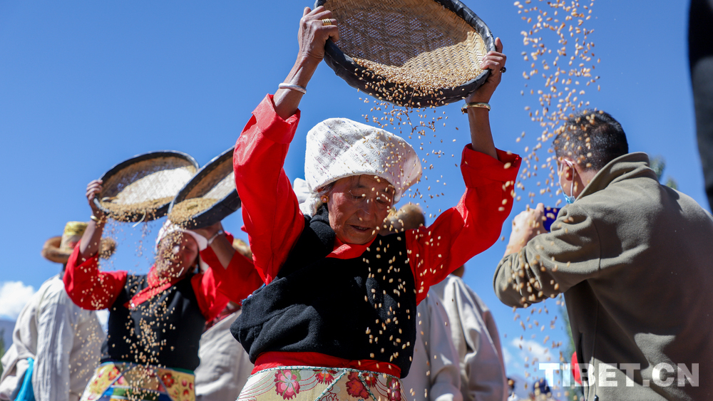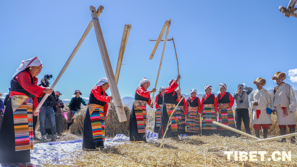 图为“庆丰收”活动现场,当地村民展示传统青稞脱粒 摄影:贾华加