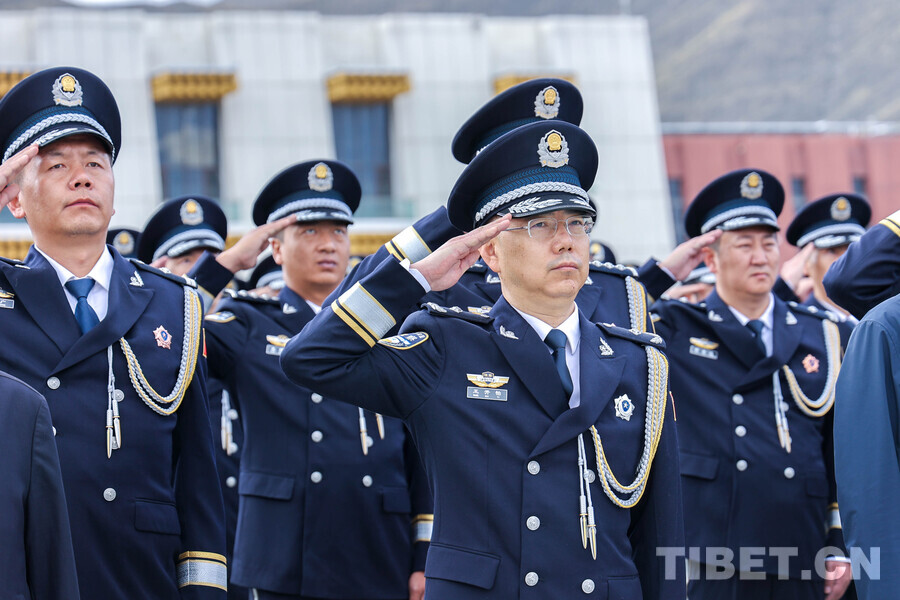 图为拉萨市高新区管委会、青藏铁路集团公司拉萨办事处、拉萨铁路公安处、拉萨火车站、柳梧公安局等单位的职工、民警参加升旗仪式