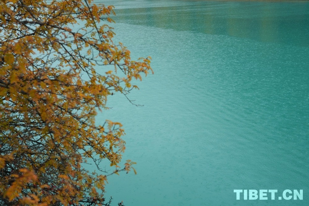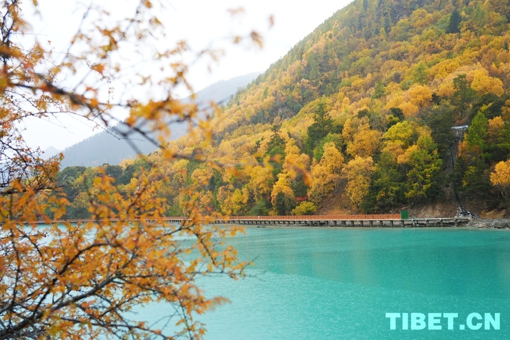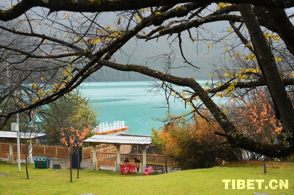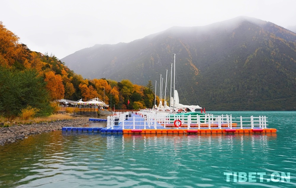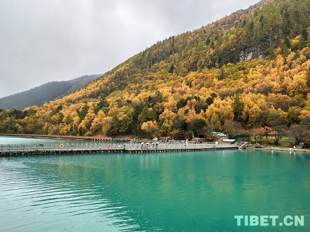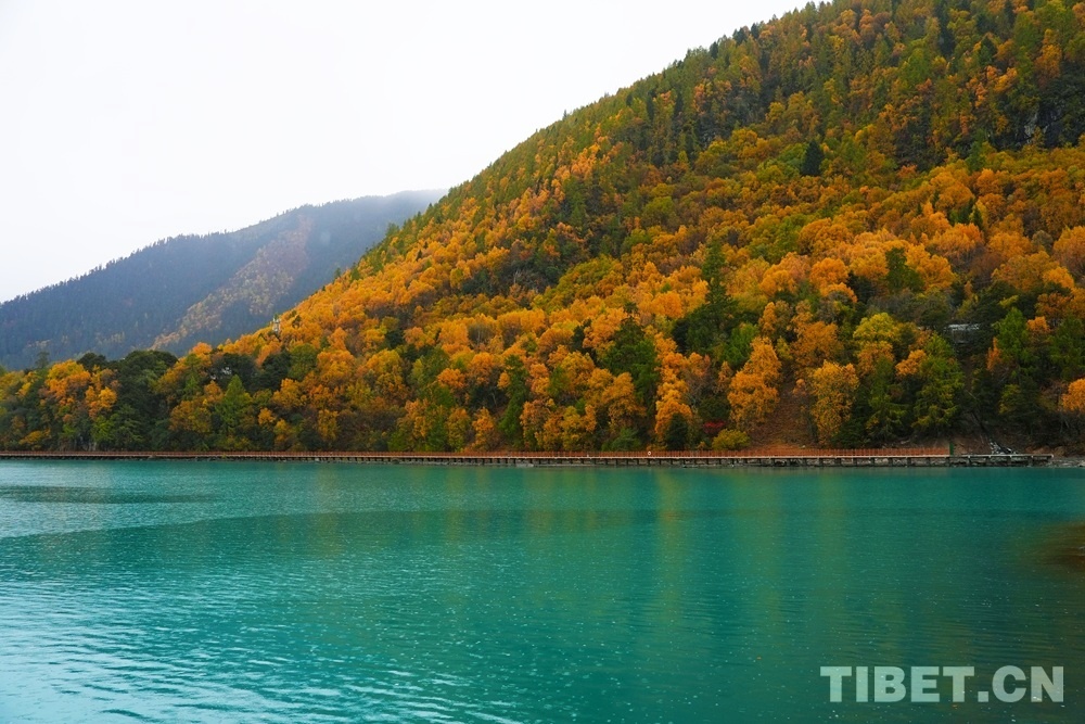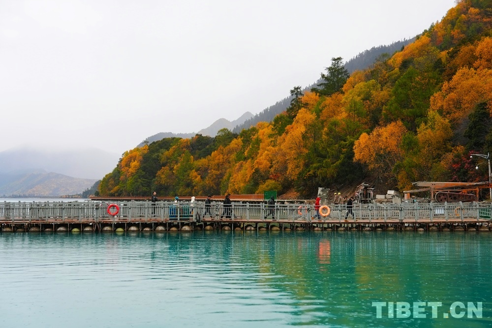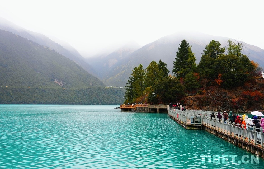 巴松错又名错高湖,位于西藏自治区林芝市工布江达县,是西藏首个自然风景类国家5A级旅游风景区。深秋时节,一场不期而遇的细雨,为巴松错披上了一层朦胧的面纱。图为游客在景区浮桥上游览 摄影:姚浩然
