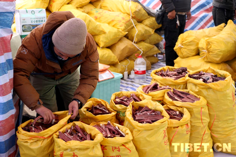图为第45届雅砻物资交流会现场,商家正忙碌地摆摊,准备销售自家制作的牛肉干 摄影:拥青卓嘎