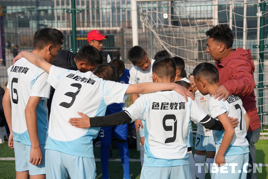 图为西藏那曲市色尼区青少年足球运动员赛前围圈加油 摄影:宋俊