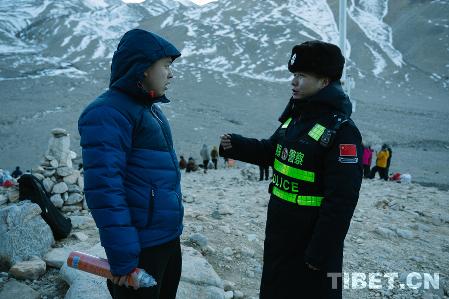 图为西藏出入境边防检查总站珠峰边境派出所移民管理警察在珠峰大本营景区与游客交流,并交待安全事项 摄影:蒋美灵