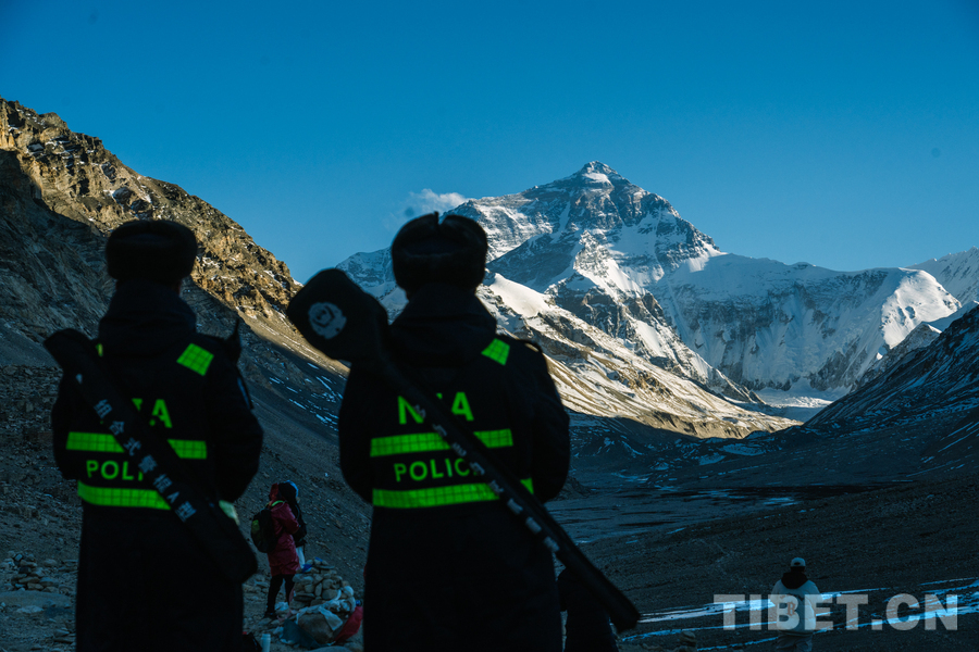 图为西藏出入境边防检查总站珠峰边境派出所移民管理警察在珠峰大本营景区执勤 摄影:蒋美灵