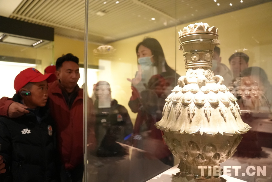 图为讲解员向师生介绍青瓷莲花尊 摄影:苏洋