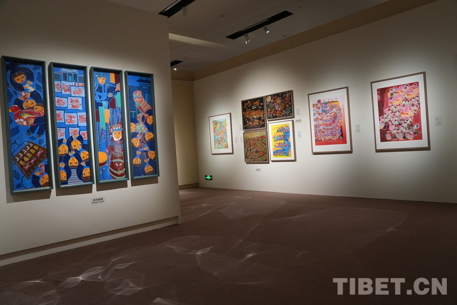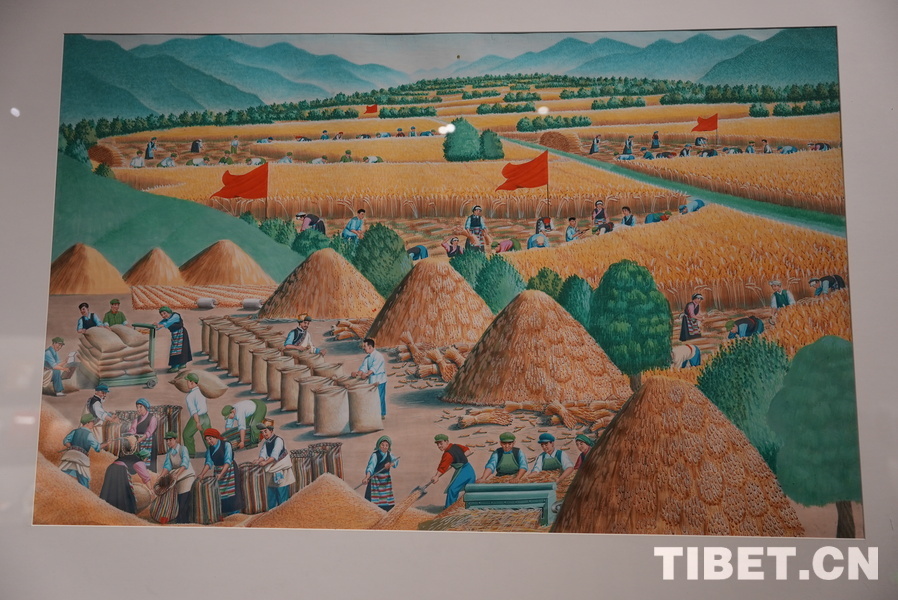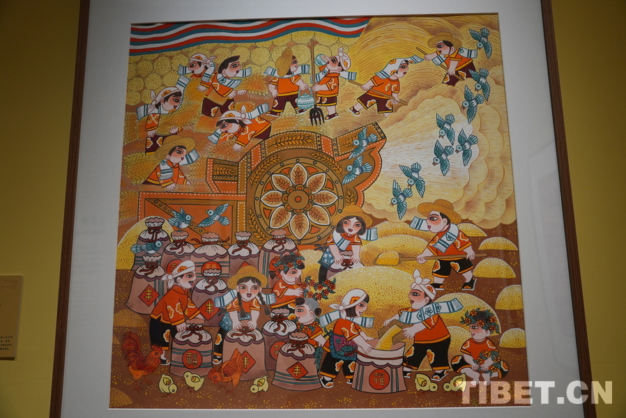 展览紧扣“乡村活力·时代精神”主题,分“叙民俗”“展农事”“焕新貌”三个单元,生动呈现了新时代农民画笔下的乡村巨变与生活百态。图为画作《高原又是丰收年》 摄影:苏洋