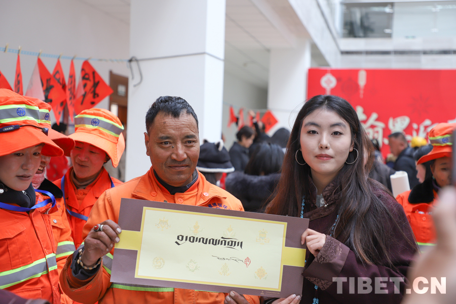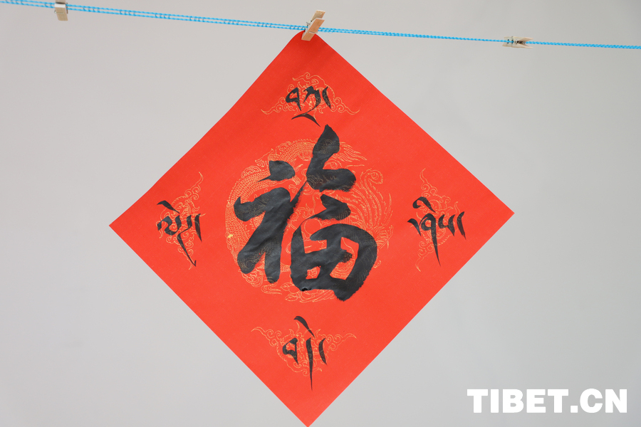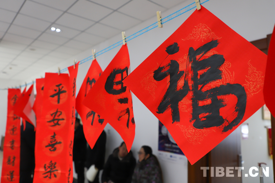 活动现场,六位来自西藏书法家协会的书法家挥毫泼墨,一副副寓意吉祥的春联、一个个饱含深情的“福”字在他们的笔下诞生。图为活动现场浓浓的年味 摄影:贾华加 (中国西藏网 记者/贾华加)