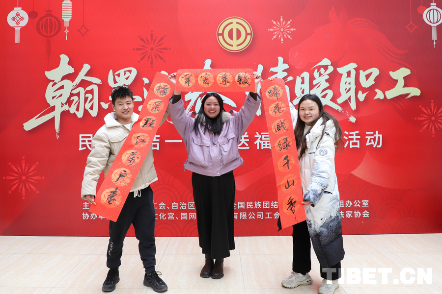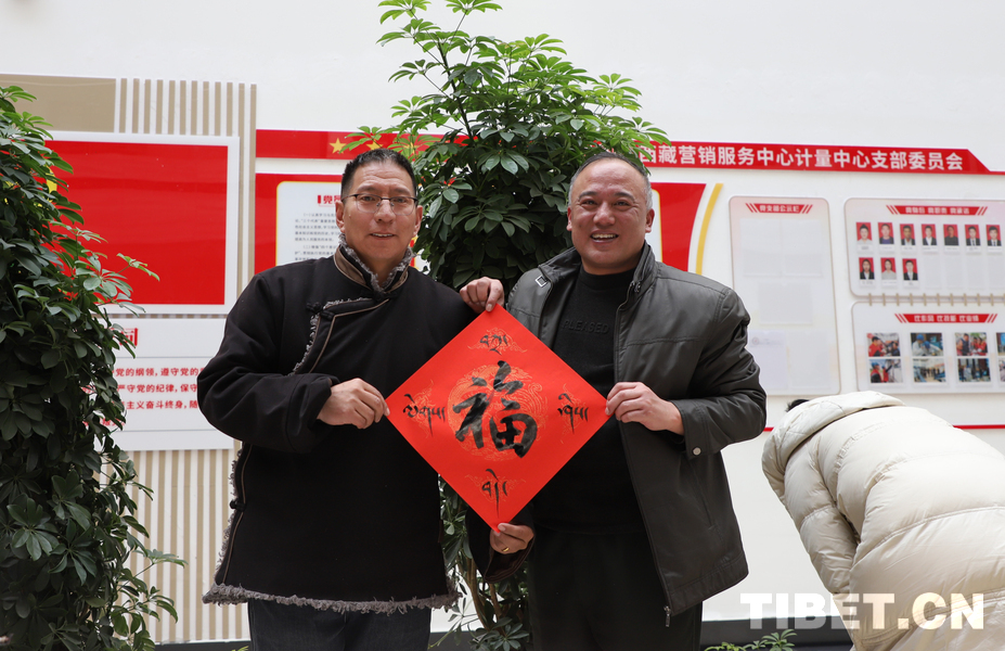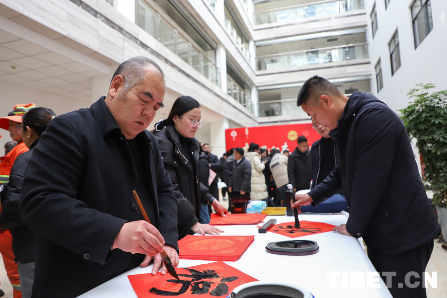 中国西藏网讯 1月29日下午,由西藏自治区总工会、自治区着力创建全国民族团结进步模范区专项组办公室共同主办的“翰墨迎春·情暖职工——民族团结一家亲”送福进企业活动在国网西藏电力有限公司举行。图为书法家挥毫泼墨为职工送祝福 摄影:贾华加