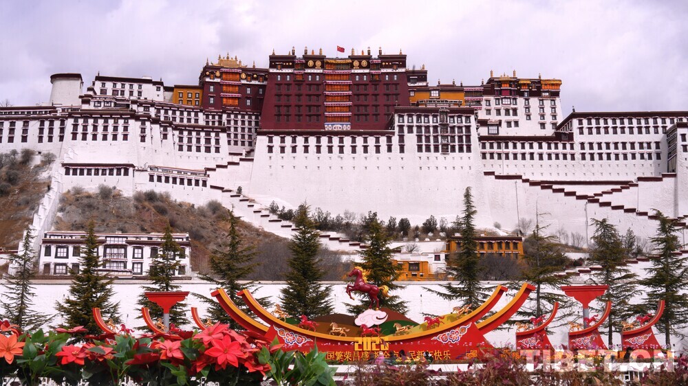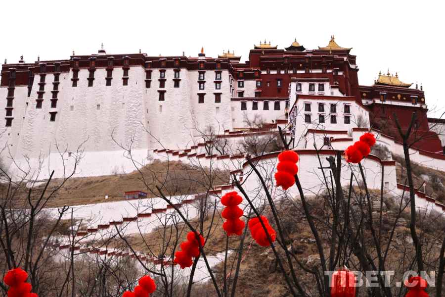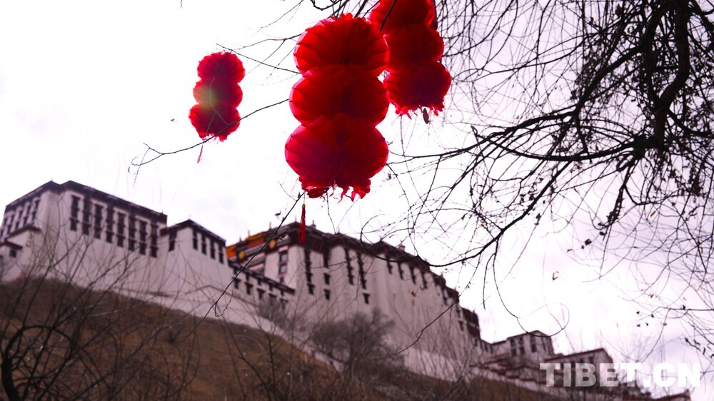 中国西藏网讯 春节与藏历新年将至,拉萨满城张灯结彩,红灯笼装点大街小巷。这座高原古城已沉浸在浓郁的新春氛围中。(中国西藏网 实习记者/张艺彤 宋俊)图为庄严的布达拉宫与马年新春地标相映成景 摄影:张艺彤