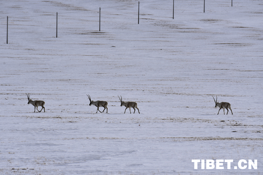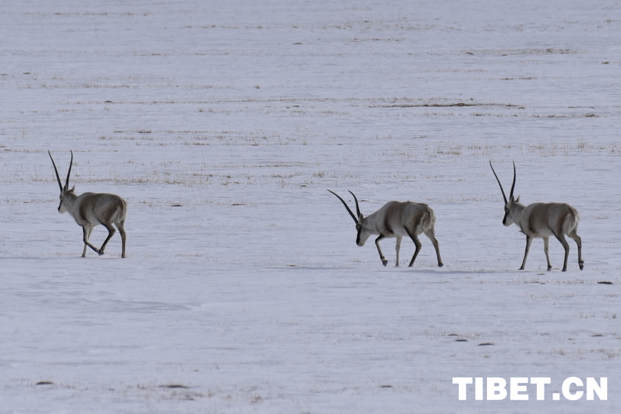 图为藏羚羊在雪地上迁徙 摄影:赵振宇
