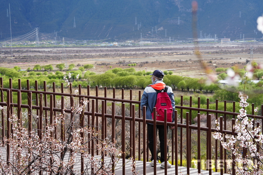 游客在嘎拉村的春日观景步道赏花拍照 摄影:张艺彤