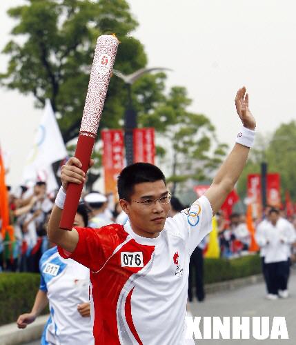 5月24日,火炬手吴雷鸣手持火炬传递。当日,北京奥运会圣火继续在上海传递。 新华社记者凡军摄