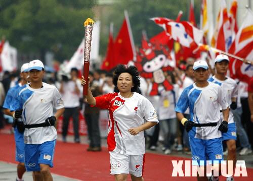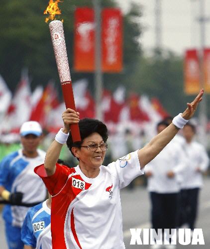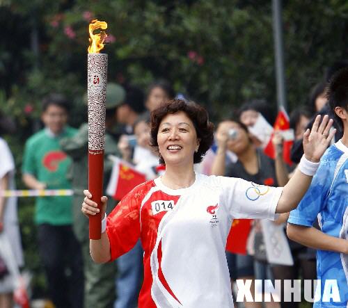 5月24日,火炬手吉粉花手持火炬传递。当日,北京奥运会圣火继续在上海传递。 新华社记者凡军摄