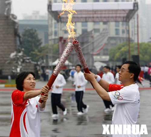 5月24日,第一棒火炬手孙雯(左)与火炬手陈飞交接。当日,北京奥运会圣火继续在上海传递。 新华社记者凡军摄