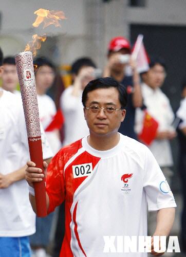 5月24日,刚刚完成了第一阶段抗震救灾任务归来的上海市公安消防总队总队长陈飞少将手持火炬传递。当日,北京奥运会圣火继续在上海传递。 新华社记者凡军摄
