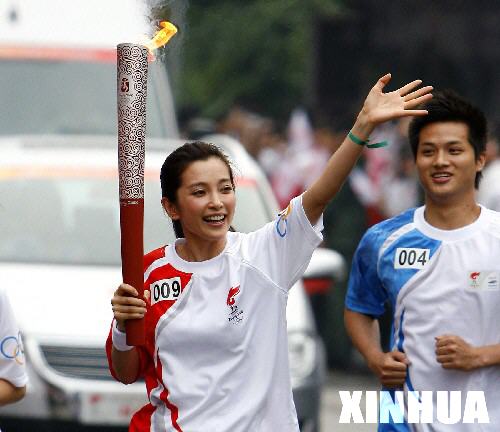 5月24日,火炬手李冰冰手持火炬传递。当日,北京奥运会圣火继续在上海传递。 新华社记者凡军摄