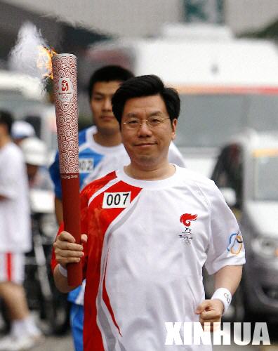 5月24日,火炬手李开复手持火炬传递。当日,北京奥运会圣火继续在上海传递。 新华社记者凡军摄