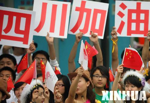 5月24日,群众在观看火炬传递活动时打出“四川加油”的标语。当日,北京奥运会圣火继续在上海传递。 新华社记者邢广利摄 |