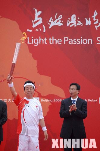 5月26日,第一棒火炬手张云泉(左)在起跑仪式上展示火炬。当日,北京奥运会圣火在江苏泰州传递。 新华社记者韩瑜庆摄