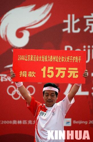 5月26日,第一棒火炬手张云泉在起跑仪式上代表泰州站全体火炬手、护跑手向四川地震灾区捐款。当日,北京奥运会圣火在江苏泰州传递。 新华社记者韩瑜庆摄