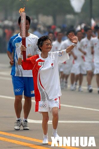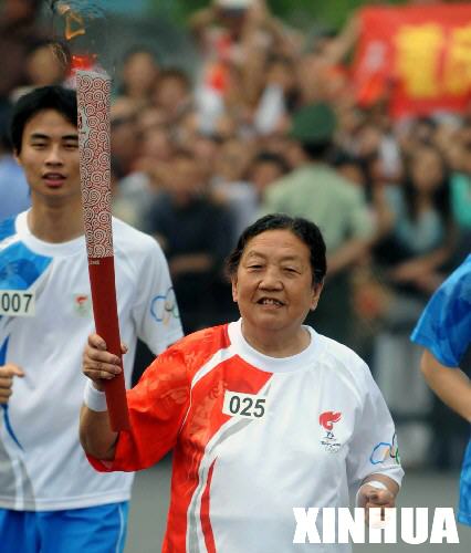 5月26日,火炬手周剑秋在进行传递。当日,北京奥运会圣火在江苏泰州传递。 新华社记者韩瑜庆摄