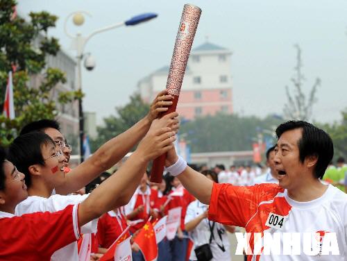 5月26日,火炬手、泰州中学校长蒋建华(右)在泰州中学校园内完成传递后,让学生们触摸火炬。当日,北京奥运会圣火在江苏泰州传递。 新华社记者孙参摄