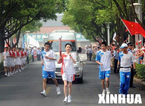5月26日,火炬手徐颖在进行传递。当日,北京奥运会圣火在江苏泰州传递。 新华社记者安治平摄
