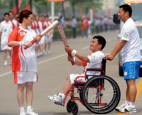 5月26日,残疾人火炬手常新成(中)与下一棒火炬手金波交接。当日,北京奥运会圣火在江苏泰州传递。 新华社记者安治平摄