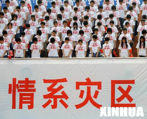 5月26日,学生们在起跑仪式上向四川地震遇难同胞默哀。当日,北京奥运会圣火在江苏泰州传递。 新华社记者孙参摄 |