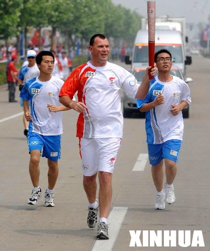 5月26日,火炬手、新西兰人汉南在进行传递。当日,北京奥运会圣火在江苏泰州传递。 新华社记者安治平摄