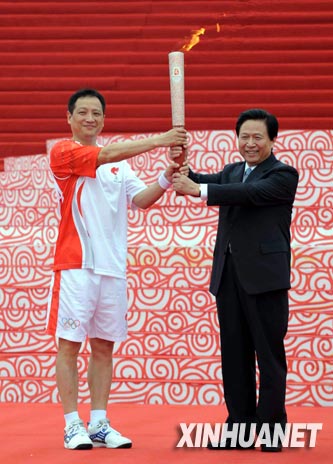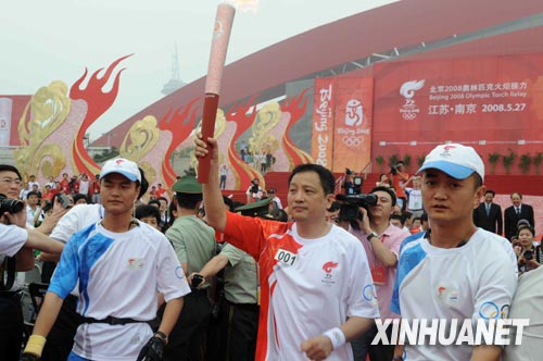 5月27日,江苏省委书记梁保华(右)在起跑仪式上将火炬交给第一棒火炬手杨阳。当日,北京奥运会圣火在江苏南京传递。新华社记者 丁林 摄