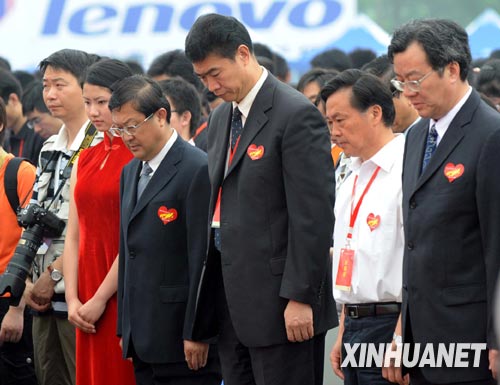 5月27日,各界人士在起跑仪式上为四川地震遇难同胞默哀。新华社记者 孙参 摄