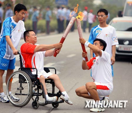 5月27日,火炬手马兆森(前右)与残疾人火炬手虞健交接。新华社记者 邢广利 摄