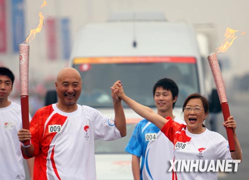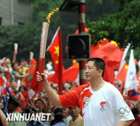 5月27日,火炬手、前中国男篮队员胡卫东在进行传递。新华社记者 杨磊 摄