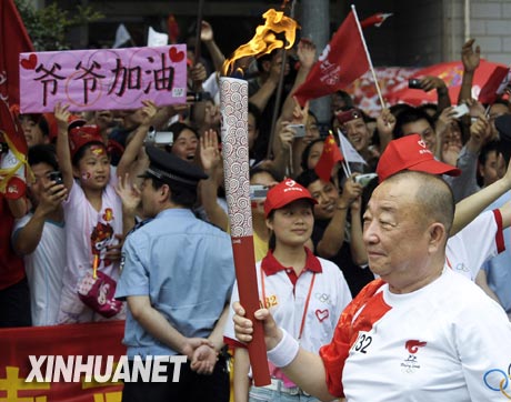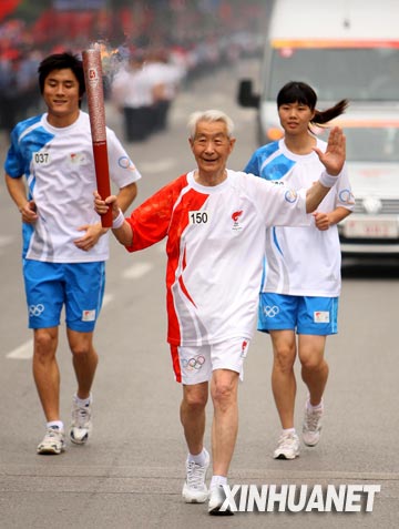 5月27日,南京站年龄最大的火炬手、现年91岁的徐祗则在进行传递。新华社记者 邢广利 摄