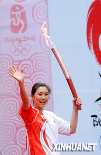 5月27日,最后一棒火炬手、前中国女排队员孙玥在结束仪式上向观众致意。当日,北京奥运会圣火在江苏南京传递。新华社记者 姜帆 摄