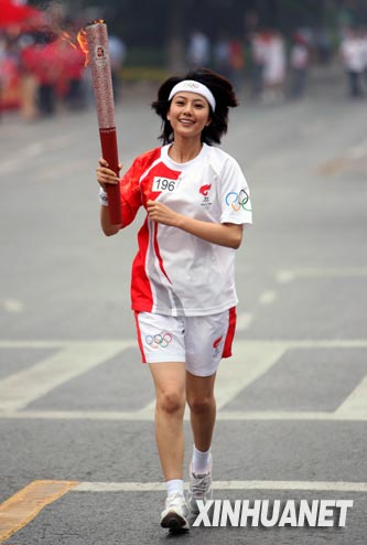5月27日,火炬手高园园在进行传递。新华社记者 李颖 摄