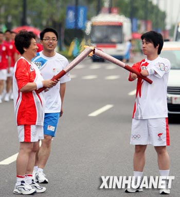 5月28日,奥运火炬手王恒(右)与姜宗仪在传递过程中交接。新华社记者 邢广利 摄