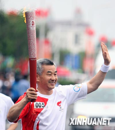5月28日,奥运火炬手李洪涛手持火炬传递。新华社记者 邢广利 摄